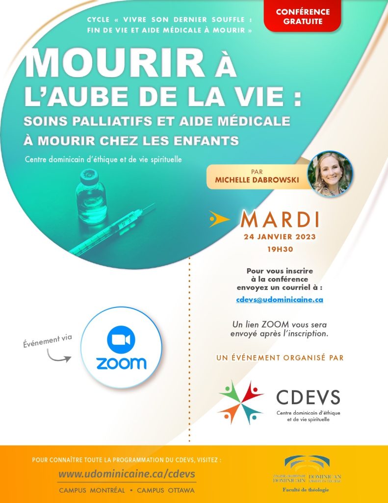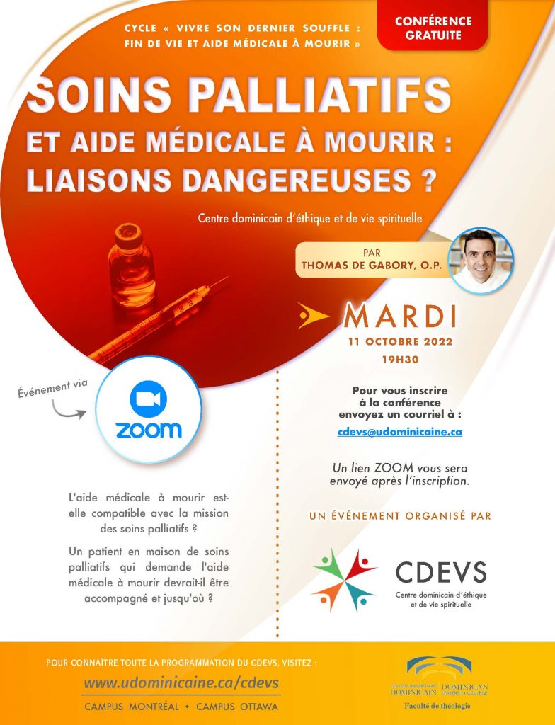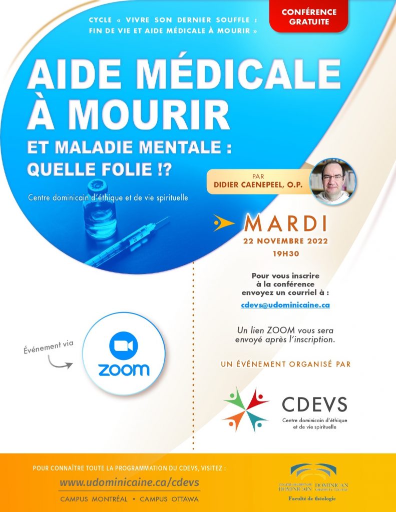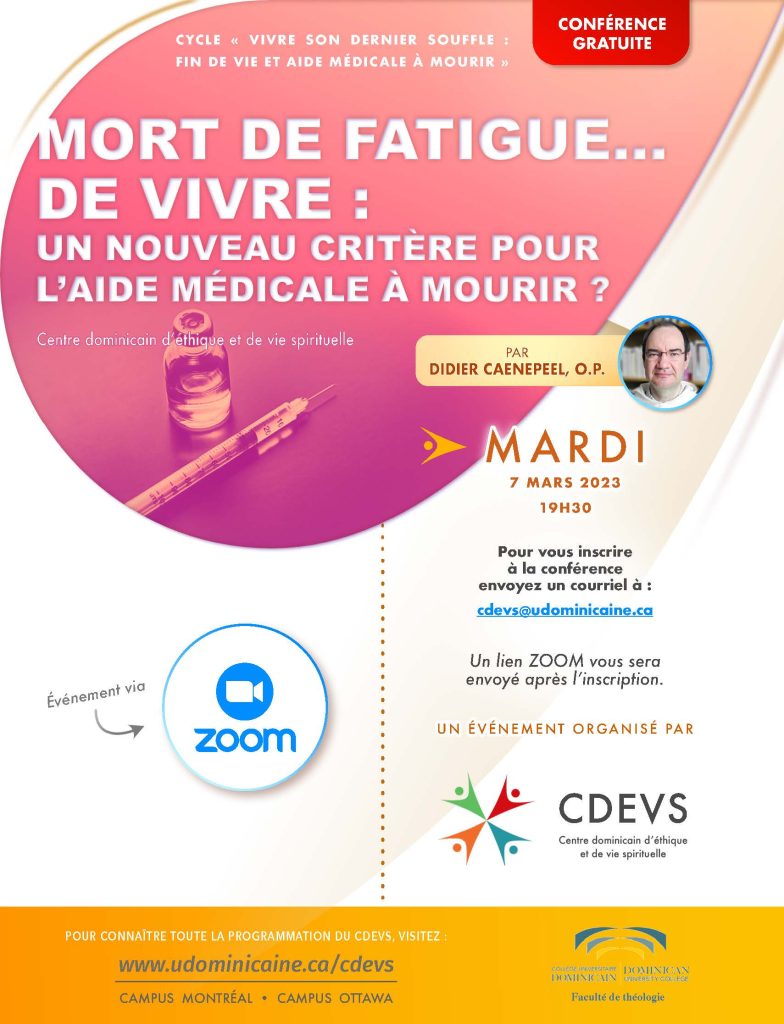 Le Centre dominicain d’éthique et de vie spirituelle (CDEVS) propose « Mort de fatigue… de vivre : un nouveau critère pour l’aide médicale à mourir ? » le mardi 7 mars à 19h30 (heure du Québec et de l’Ontario) par Didier Caenepeel, dominicain et professeur de bioéthique au Collège universitaire dominicain.